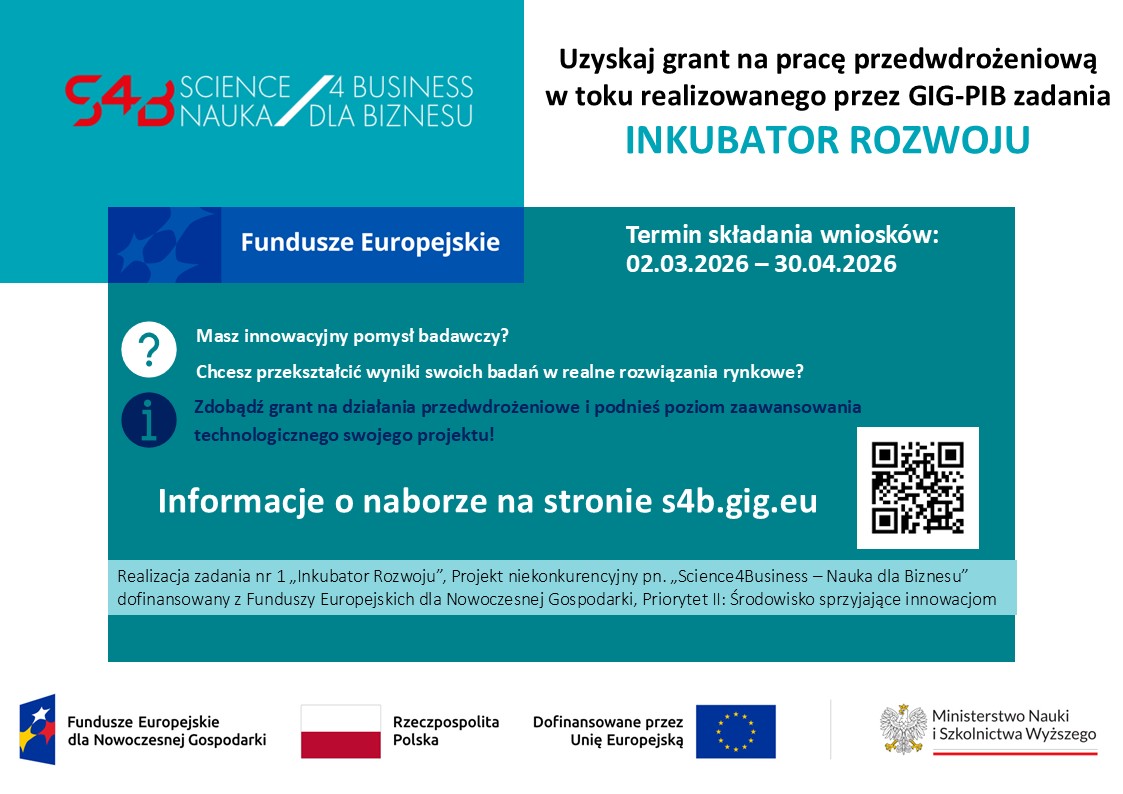 GIG-PIB ogłasza rozpoczęcie drugiego naboru wniosków o udzielenie wsparcia w ramach projektu „Inkubator Rozwoju”, realizowanego w programie Science4Business. Inicjatywa jest skierowana do twórców innowacyjnych pomysłów badawczych, którzy chcą przekształcić wyniki swoich prac w gotowe rozwiązania rynkowe.